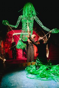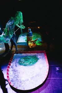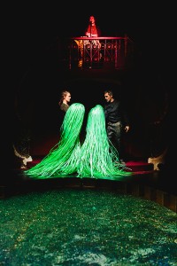 Lange und laufende Nasen ziehen Sprechmaschinen auf, Wassermänner und Nixen schwimmen auf verkokste Problembären zu, Wiedergänger aus bodenlangem Haar streichen durch die Räume des Etablissements, Hampelmenschen verlieren ihre raumfahrende Gehirne – und alles sucht: Die richtige Tür zum 1000m2 großen Ballroompool.